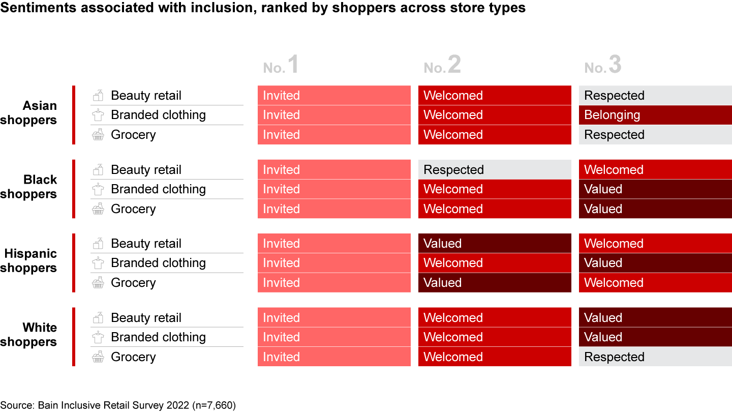 Inclusion might seem impossible to pin down, meaning too many things to too many people. That’s not what we found. Common themes can guide retailers in inclusive journeys. We asked shoppers to break down the sentiments they experienced when shopping in what they deemed to be an inclusive environment. How important was a sense of belonging? A sense of being valued, respected, or treated fairly? Across races and ethnicities, two sentiments—of being “invited” and “welcomed”—emerged above the rest (see Figure 1).